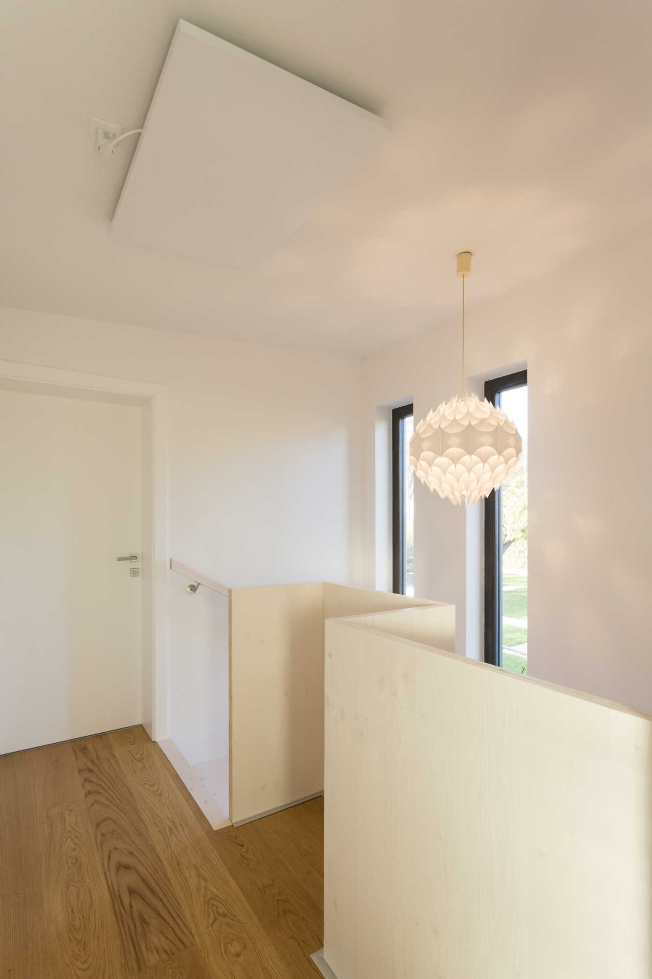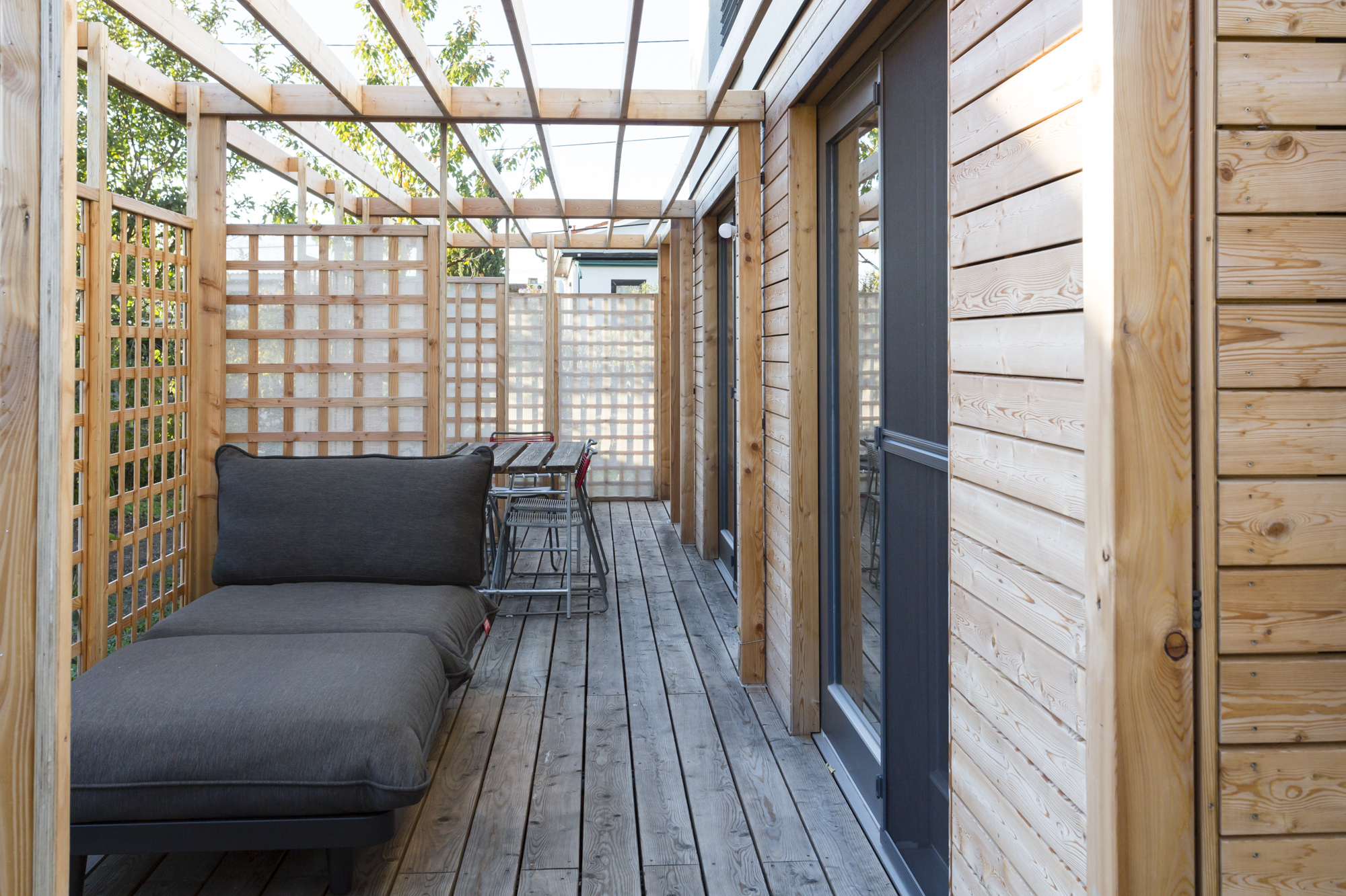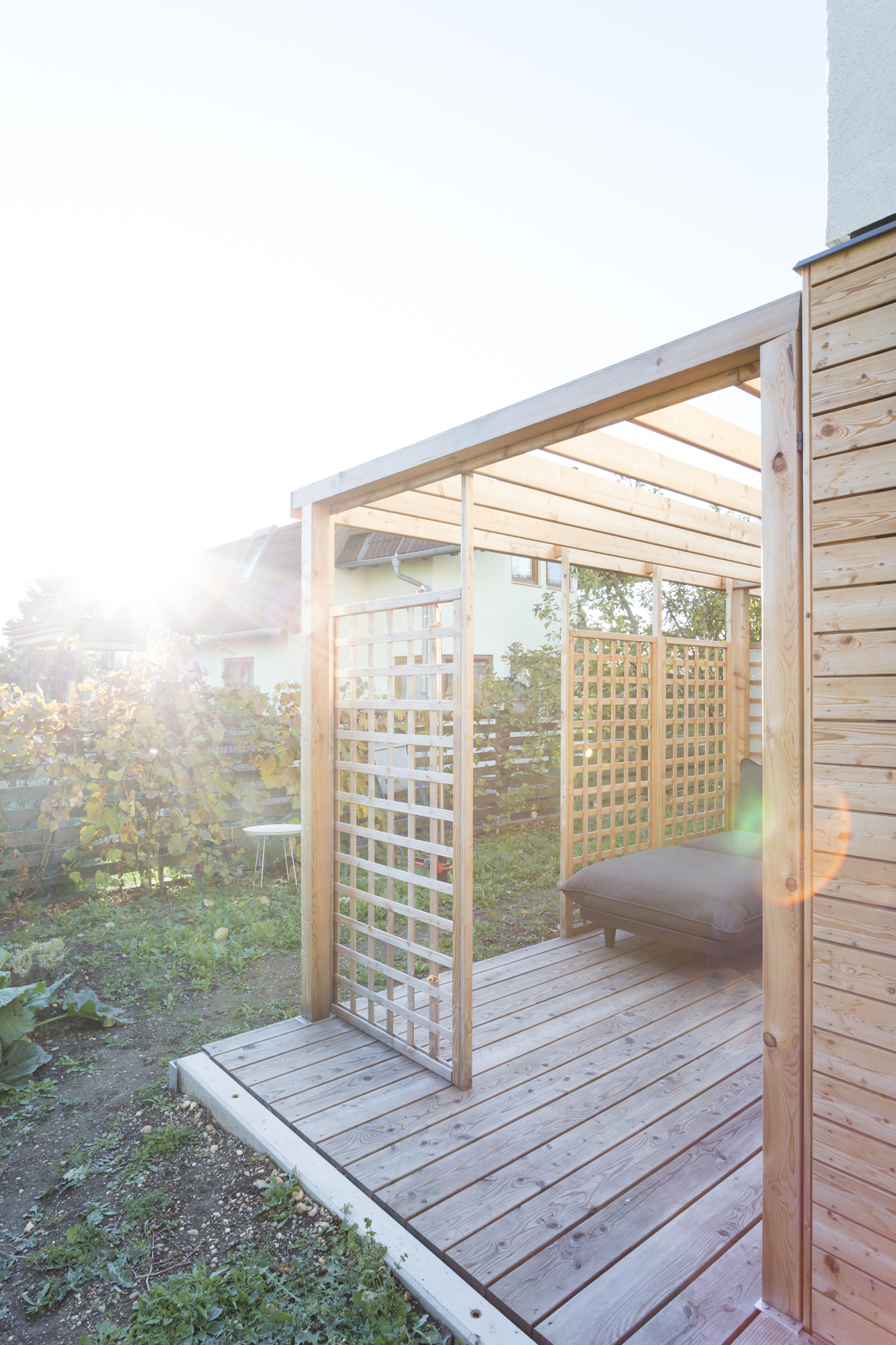 Im Erdgeschoss sind die zentralen Wohnbereiche des Hauses organisiert. Wohnen, Essen und Küche gehen offen ineinander über und stehen in direkter Verbindung zu Terrasse und Garten. Holzoberflächen und sichtbare Konstruktionselemente prägen den Innenraum und schaffen eine warme, ruhige Atmosphäre. Ein Badezimmer mit Dusche ergänzt das Raumprogramm auf dieser Ebene.Im Obergeschoss befinden sich zwei Schlafzimmer sowie ein weiteres Badezimmer mit Badewanne. Die Dachform verleiht dem Obergeschoss eine besondere räumliche Qualität und trägt zum großzügigen Charakter des Hauses bei.Die umlaufende Terrasse ist ein wesentlicher Teil des architektonischen Konzepts. Pergolen und bepflanzte Bereiche schaffen fließende Übergänge zwischen Innen- und Außenraum, bieten Platz zum Gärtnern und erweitern den Wohnraum nach außen. So entsteht ein Haus, das modulares Bauen, effiziente Flächennutzung und die Idee des Wiener Kleingartenhauses auf natürliche Weise miteinander verbindet.
