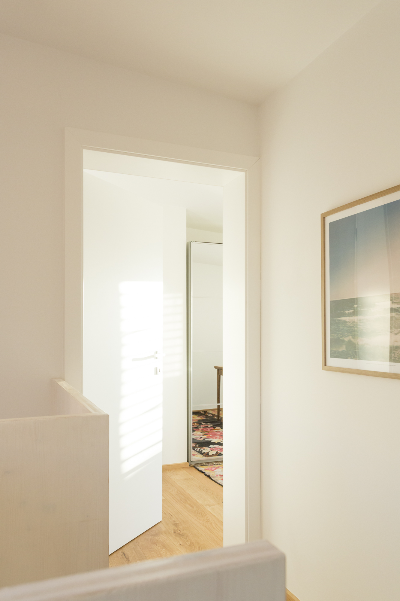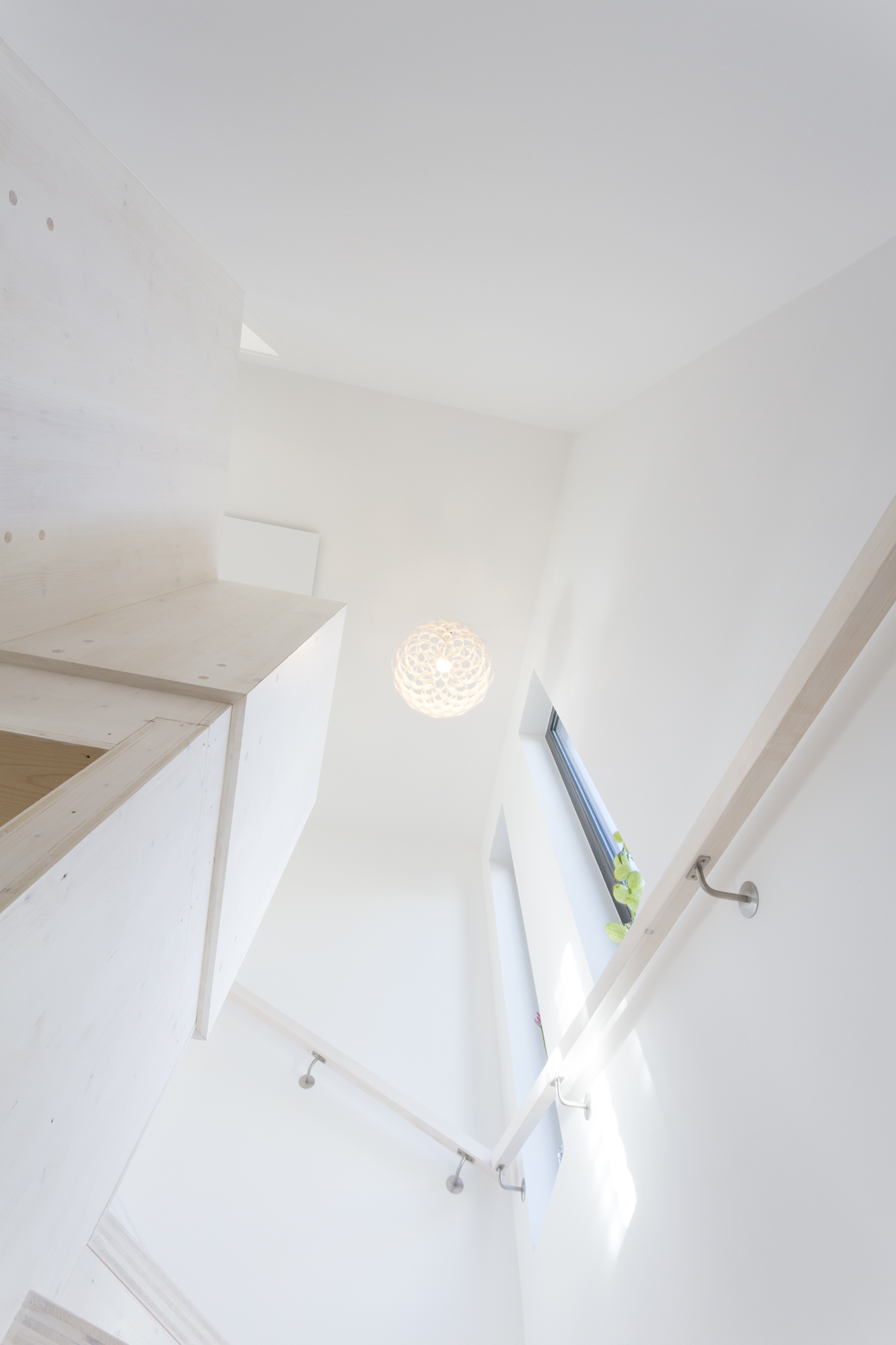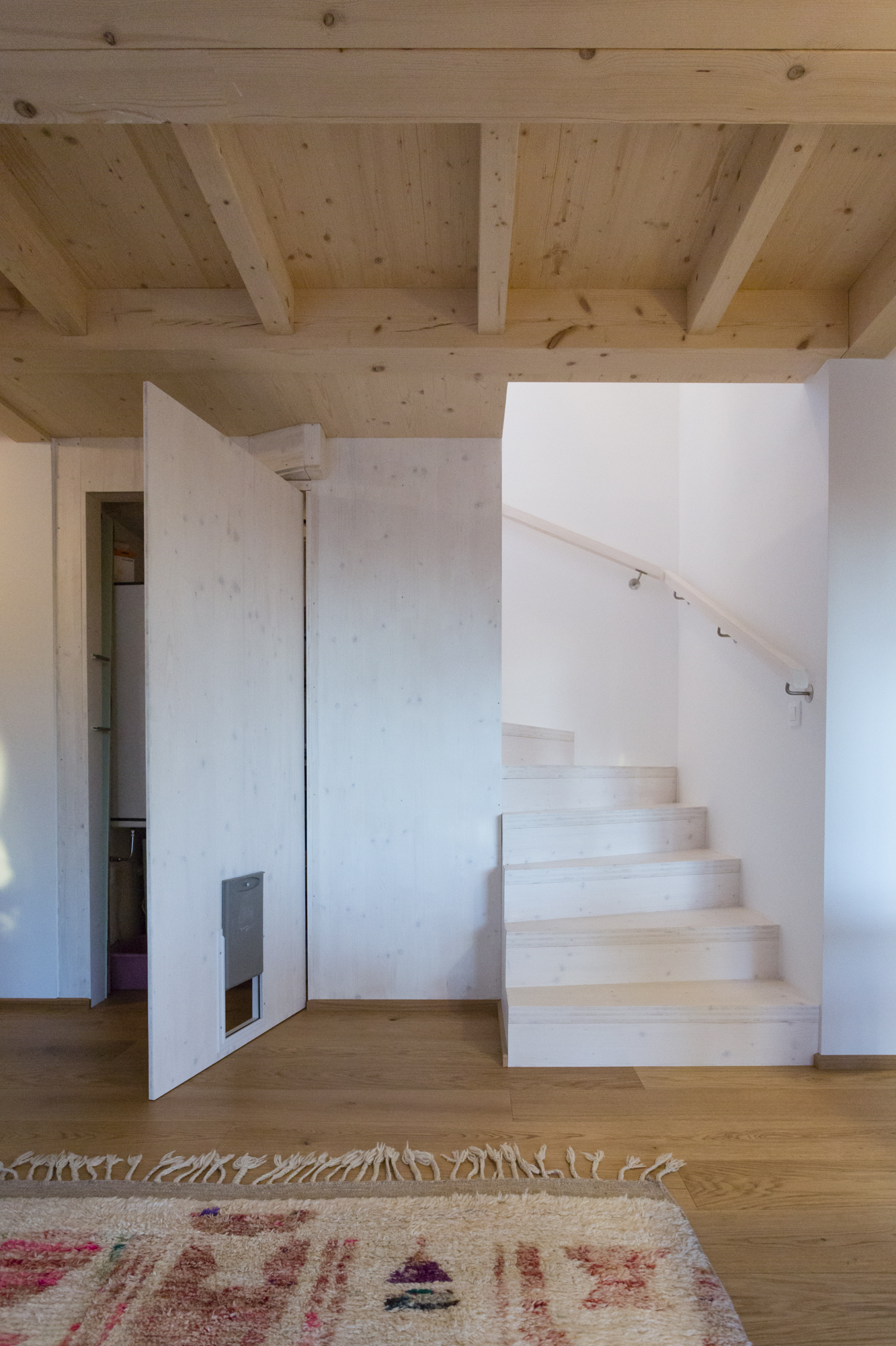 Im Erdgeschoss sind die zentralen Wohnbereiche des Hauses organisiert. Wohnen, Essen und Küche gehen offen ineinander über und stehen in direkter Verbindung zu Terrasse und Garten. Holzoberflächen und sichtbare Konstruktionselemente prägen den Innenraum und schaffen eine warme, ruhige Atmosphäre. Ein Badezimmer mit Dusche ergänzt das Raumprogramm auf dieser Ebene.Im Obergeschoss befinden sich zwei Schlafzimmer sowie ein weiteres Badezimmer mit Badewanne. Die Dachform verleiht dem Obergeschoss eine besondere räumliche Qualität und trägt zum großzügigen Charakter des Hauses bei.Die umlaufende Terrasse ist ein wesentlicher Teil des architektonischen Konzepts. Pergolen und bepflanzte Bereiche schaffen fließende Übergänge zwischen Innen- und Außenraum, bieten Platz zum Gärtnern und erweitern den Wohnraum nach außen. So entsteht ein Haus, das modulares Bauen, effiziente Flächennutzung und die Idee des Wiener Kleingartenhauses auf natürliche Weise miteinander verbindet.
