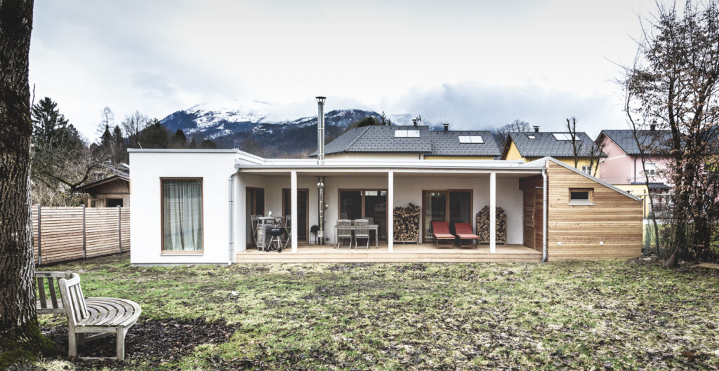 COMMOD Casa Veranda: horizontale Fichtenholzfassade geölt bzw. weiß verputzt